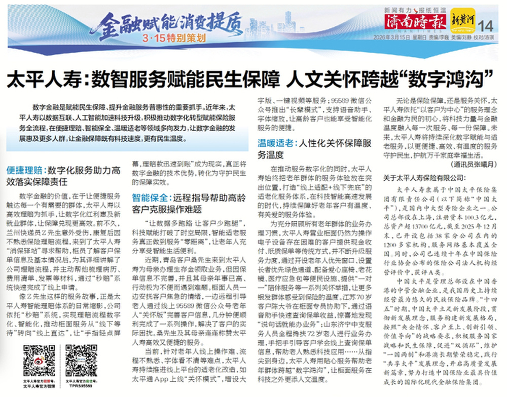 无论是保险保障,还是服务关怀,太平人寿依托“以客户为中心”的服务理念和金融为民的初心,将科技力量与金融温度融入每一次服务、每一份保障。未来,太平人寿将持续深化数字赋能与适老服务,以更便捷、高效、有温度的服务守护民生,护航万千家庭幸福生活。