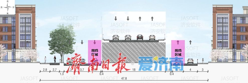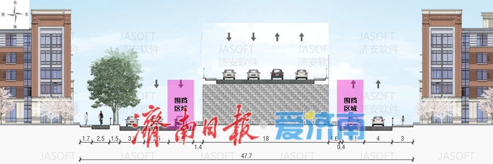 桥下东半幅:机动车保留1车道通行,非机动车利用路缘石上道路/人行道通行,设置机非隔离护栏;