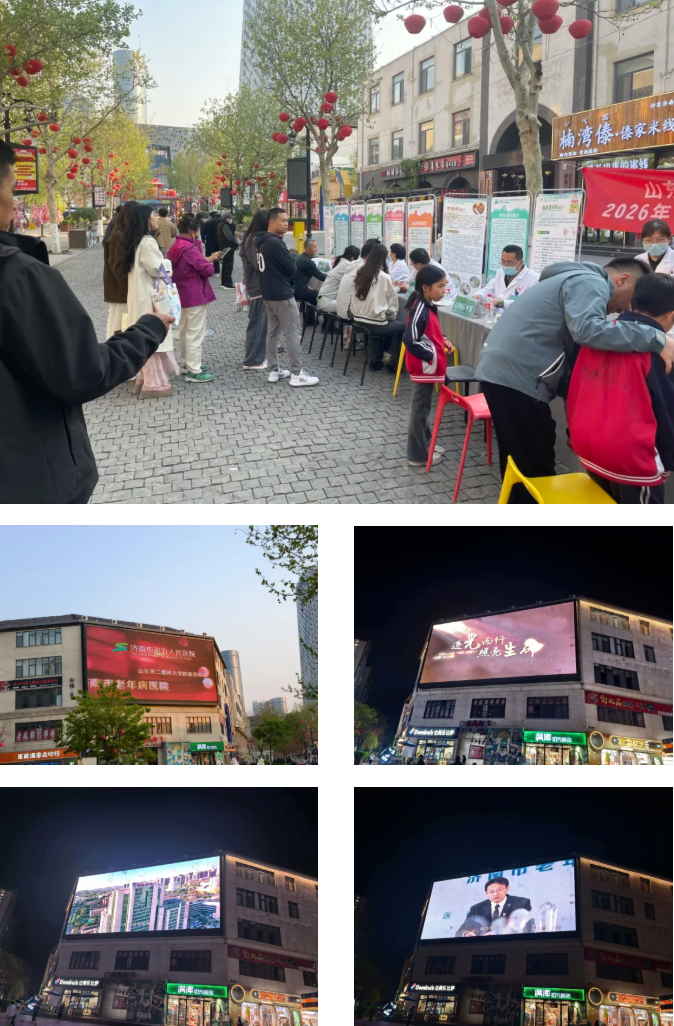 活动现场,各科室均摆放了科室及专家简介易拉宝,并发放健康教育处方、科室宣传材料,让群众在获取健康知识的同时,也对济南市第五人民医院的学科特色和专家团队有了更深入的了解。印象济南中央广场大屏幕滚动播放济南市第五人民医院宣传片,吸引众多过往市民驻足观看。