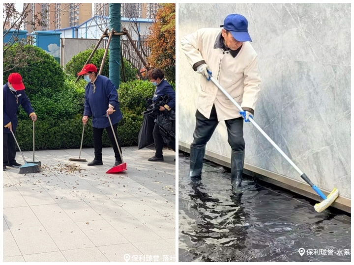 保利物业开展净美家园行动,不放过地库、墙角等任何一个角落,进行卫生清理,园区落叶也被细心清扫。大堂墙面、电梯缝隙、消防栓背面……对这些平时“看不见”的地方,物业工作人员一一擦拭干净。干净整洁,成为家园环境中最朴素也最动人的底色。