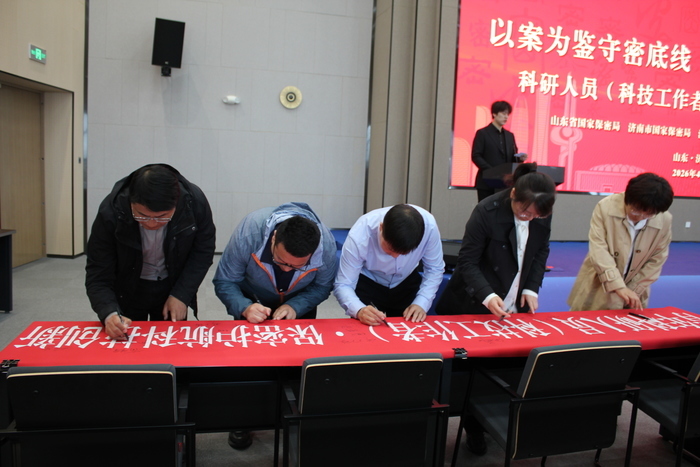 本次活动以“以案为鉴守密底线,护航科创安全发展”为主题,旨在全市、全省科技领域和科研人员(科技工作者)中营造“学保密、懂保密、会保密”的浓厚氛围,进一步提高科技领域和科研人员(科技工作者)的保密意识常识、提升防范失窃密能力,为推进科技自立自强、维护国家安全和利益筑牢安全保密屏障。山东省和济南市部分科研院所的领导干部、涉密人员、专兼职保密干部,以及部分科研项目带头人和青年科技骨干代表参加活动。全体人员首先集中观看了国家保密局制作的科研领域保密警示教育片,后由国家超级计算济南中心青年专家代表宣读了《“青年科研人员(科技工作者)保密护航科技创新”倡议书》,全体人员在“青年科研人员(科技工作者)·保密护航科技创新”倡议横幅和《保密承诺书》上郑重签名,领取宣传教育资料。