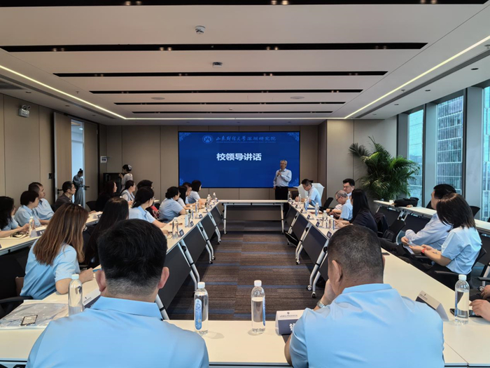 研学首站,全体学员走进山东财经大学深圳研究院,全面了解研究院立足深圳、服务粤港澳大湾区、链接鲁深政企学研资源的功能定位与发展布局。张新副校长向学员介绍学校发展战略、校友生态建设及深圳研究院服务地方经济、推动校企协同创新的重要作用,勉励学员以此次研学为契机,拓宽战略视野、链接优质资源、深化合作共赢。