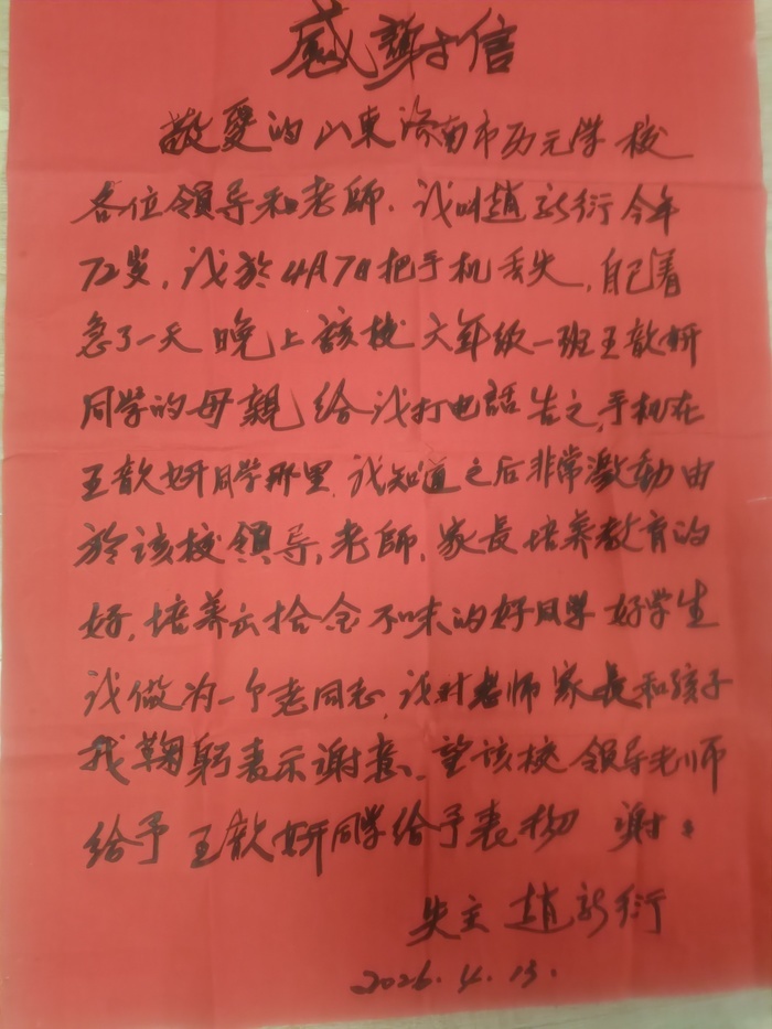 记者了解到,4月7日,赵新衍不慎遗失手机,焦急寻找一天未果。当晚,历元学校六年级一班王歆妍同学的母亲主动联系老人,告知手机被王歆妍同学拾到并妥善保管。拿到失而复得的手机,赵新衍老人激动不已。他表示,手机虽不是贵重物品,但里面存储的联系方式和资料对老年人来说十分重要。更让老人感动的是,从这件小事中看到了学校立德树人的教育成果。“由于该校领导、老师、家长培养教育的好,培养出拾金不昧的好同学、好学生。”赵新衍老人在感谢信中写道。作为一名老同志,他向学校领导、老师和家长鞠躬致谢,并恳请学校对王歆妍同学予以表扬。历元学校负责人表示,王歆妍同学的行为是学校长期坚持德育教育、家校协同育人的生动体现。学校将以此为契机,继续深化未成年人思想道德建设,培养更多品德高尚的新时代好少年。