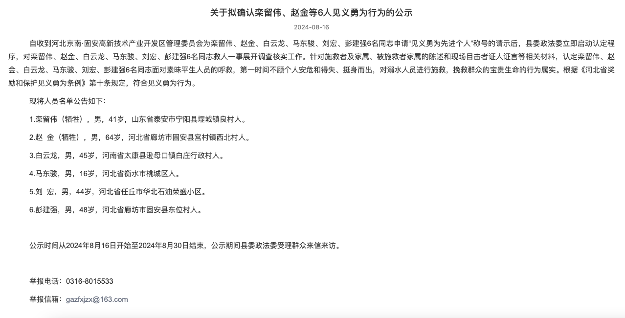 8月16日,河北固安县发布公示,拟确认栾留伟、赵金等6人见义勇为行为。救人英雄栾留伟、赵金,谢谢你们!一路走好!