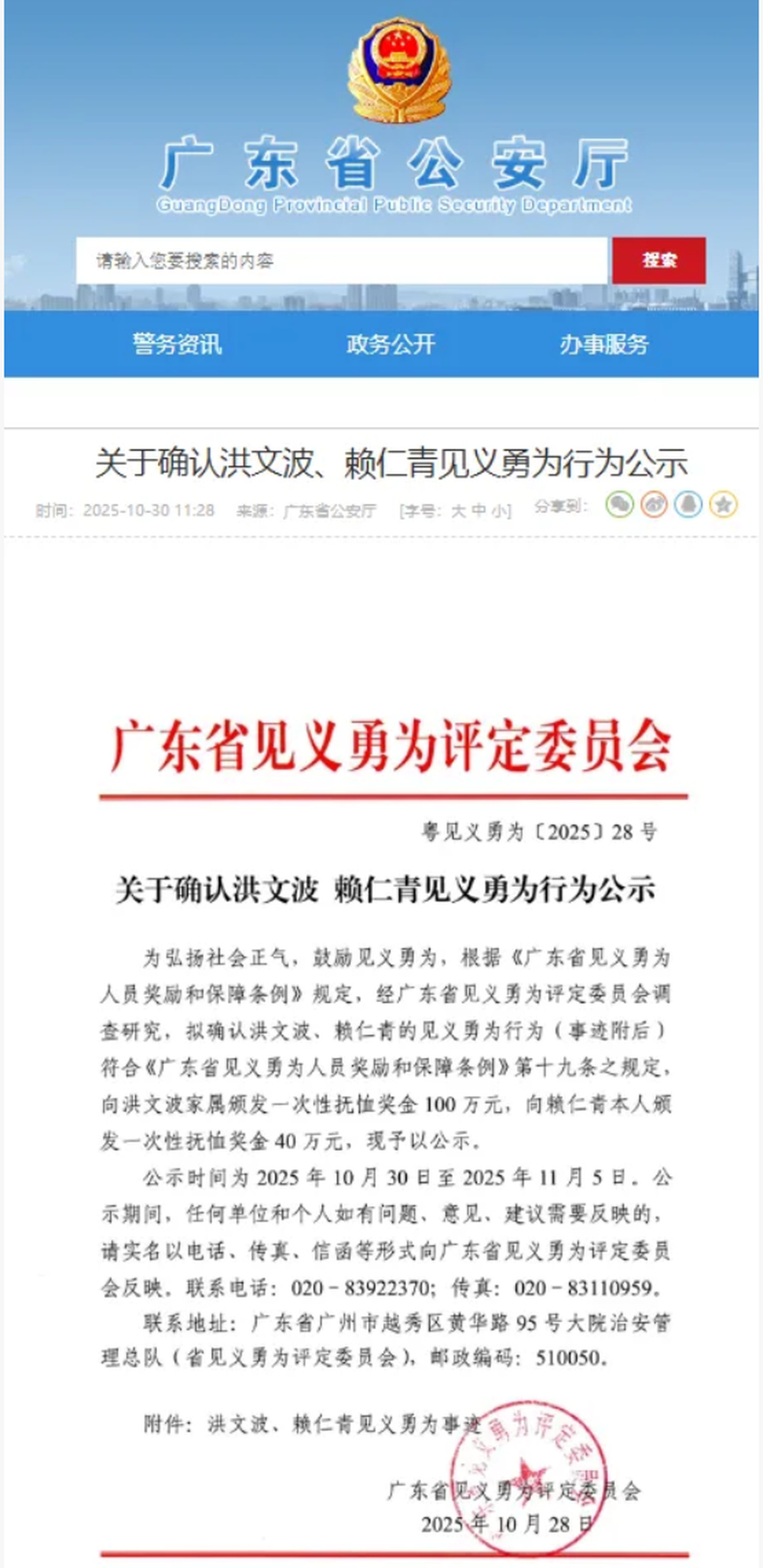 10月30日,广东省公安厅官网发布关于确认洪文波、赖仁青见义勇为行为公示,经广东省见义勇为评定委员会调查研究,拟确认洪文波、赖仁青的见义勇为行为符合《广东省见义勇为人员奖励和保障条例》第十九条之规定,向洪文波家属颁发一次性抚恤奖金100万元,向赖仁青颁发一次性抚恤奖金40万元,现予以公示。