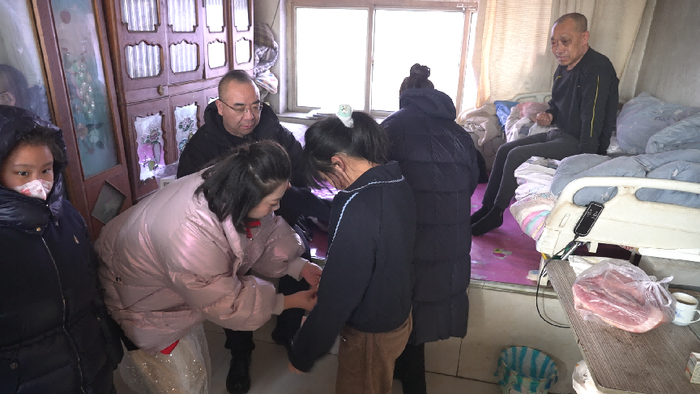 孙老师及团队又带来了满满当当的新衣服、新文具,还有过冬的猪肉。鑫鑫开心地换上新衣服,站在炕上转了一圈又一圈。而一旁的病床上,她的父亲悄悄别过脸去,抬手抹了一把眼泪。那一幕,被同行的团队成员悄悄拍下。