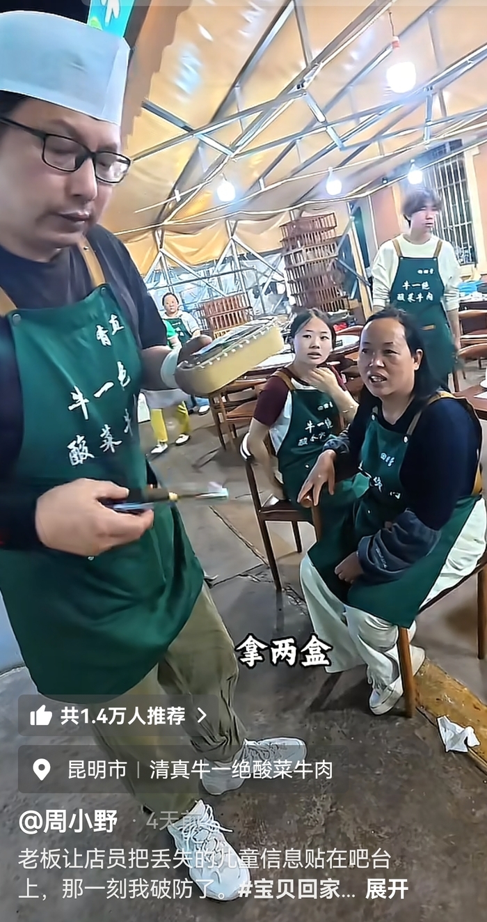近日,昆明市呈贡区“清真牛一绝酸菜牛肉”小店意外走红网络。起因是一位博主沿街推销印有寻亲信息的甜角时,该店经营人不仅欣然购买,还主动将包装盒上的“宝贝回家”寻亲信息剪下来,郑重地贴在了吧台。视频发布后迅速引爆全网关注,截至目前,该视频浏览量已突破千万,多家官方媒体转发,网友纷纷留言:“老板,这是你最后一天安稳的日子。”