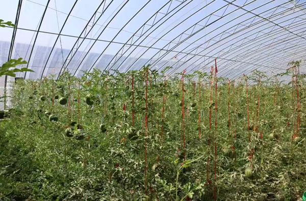 Renfeng watermelons grow along vertical vines in high-standard greenhouses in Jiyang. [Photo/WeChat account: gh_9caa8c97955c]