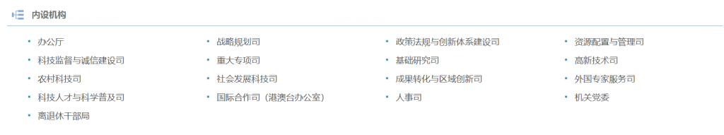 科技部官网“内设机构”栏目信息。科技部官网截图