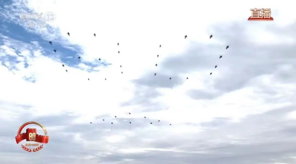 伴随着激昂的军乐,中国共产党党旗、中华人民共和国国旗、中国人民解放军军旗高高飘扬。26架直升机组成巨大的“80”字样;3架直升机分别悬挂“正义必胜”“和平必胜”“人民必胜”条幅,这是历史启示的伟大真理,这是天下正道的庄严昭告,这是和平发展的时代强音!