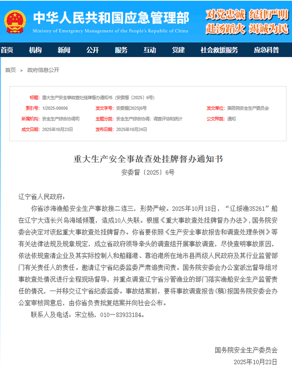 2025年10月18日,“辽绥渔35261”船在辽宁大连长兴岛海域倾覆,造成10人失联。根据《重大事故查处挂牌督办办法》,近日,国务院安委会决定对该起重大事故查处挂牌督办。以下为督办通知书全文: