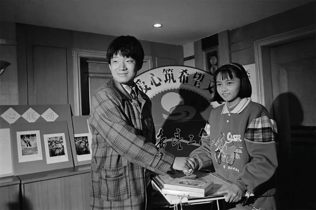苏明娟与最早为希望工程捐款的周彤同学合影。解海龙 摄