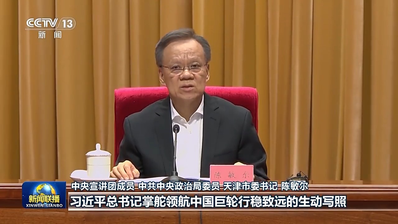 中央宣讲团成员 中共中央政治局委员 天津市委书记 陈敏尔:按照经济社会发展规律,确定奋斗目标,一以贯之团结奋进,是中国共产党人的长远观、全局观的生动写照,是在党中央集中统一领导下,实行全过程人民民主的生动写照,是十八大新时代以来,习近平总书记掌舵领航中国巨轮行稳致远的生动写照。