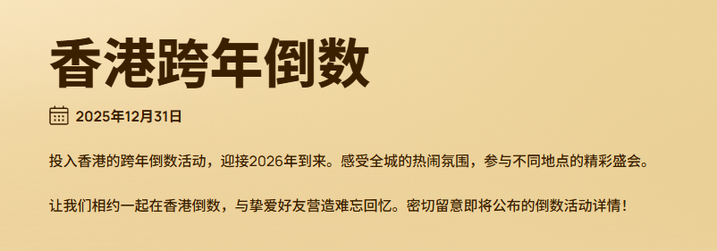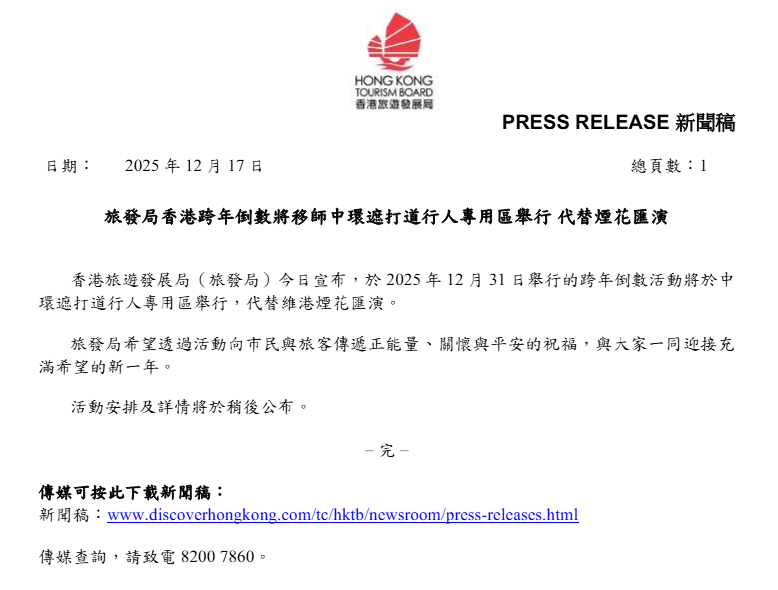 12月17日,香港旅游发展局(旅发局)宣布,于2025年12月31日举行跨年倒数活动,代替维港烟花汇演。旅发局表示,希望透过活动向市民与旅客传递正能量、关怀与平安的祝福,与大家一同迎接充满希望的新一年。