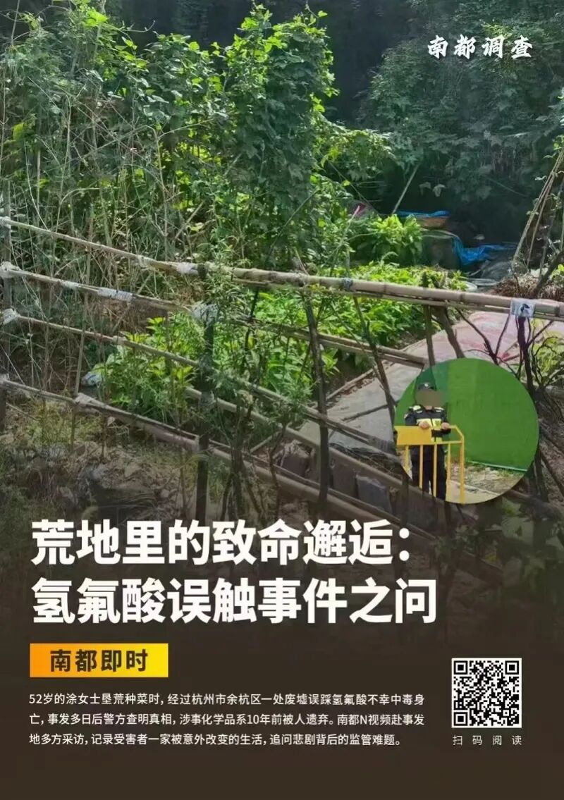 南都此前报道,2025年9月15日晚,杭州市余杭区闲林街道办事处发布通报称,9月9日,涂某某(女,52岁)在进入闲林中路附近空地时,不慎接触废弃氢氟酸中毒,送医后经抢救无效于9月14日凌晨不幸身亡。