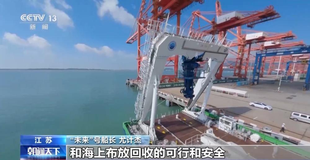 “未来”号船长 尤计杰:目前看到的白色的门架,叫A型门架。它目前是我们国内首台150吨级的门架,它的建造和使用,对我们深海装备的投放和海上布放回收的可行和安全提供了有力的保障。