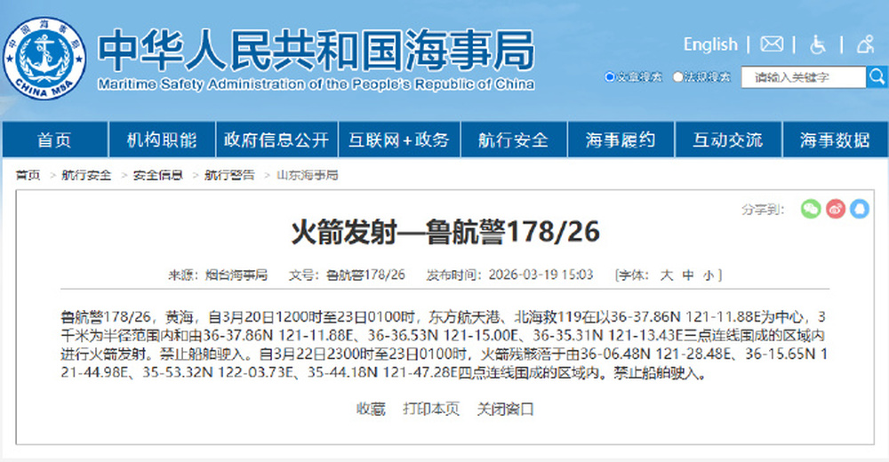 烟台海事局发布航行警告:黄海部分海域火箭发射,禁止船舶驶入