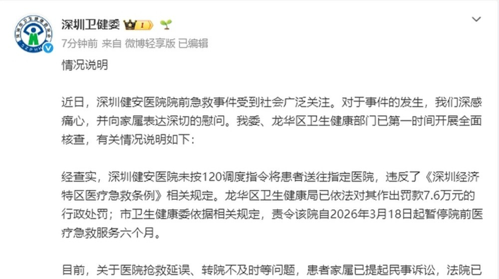 深圳市卫生健康委员会通报深圳健安医院院前急救违规事件有关情况