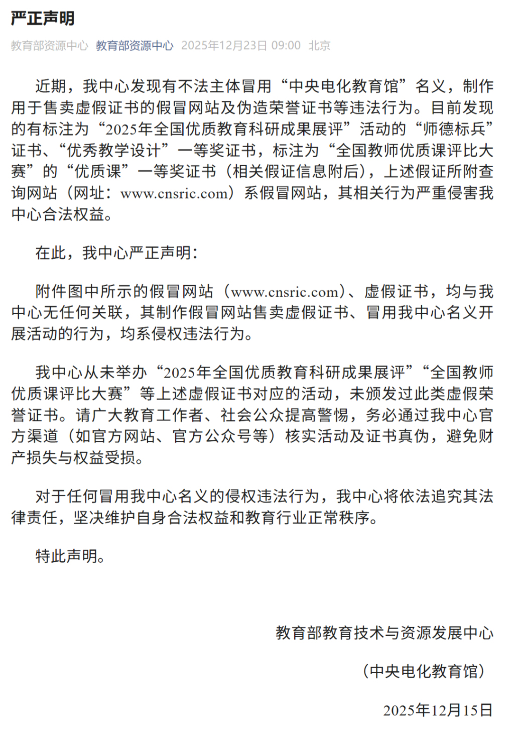 2025年12月,教育部资源中心也曾发布严正声明:近期,我中心发现有不法主体冒用“中央电化教育馆”名义,制作用于售卖虚假证书的假冒网站及伪造荣誉证书等违法行为。目前发现的有标注为“2025年全国优质教育科研成果展评”活动的“师德标兵”证书、“优秀教学设计”一等奖证书,标注为“全国教师优质课评比大赛”的“优质课”一等奖证书(相关假证信息附后),上述假证所附查询网站(网址:www.cnsric.com)系假冒网站,其相关行为严重侵害我中心合法权益。