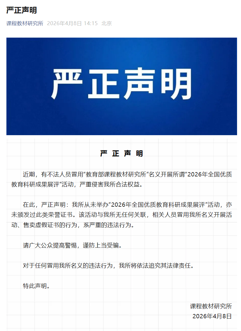 课程教材研究所在声明中表示:我所从未举办“2026年全国优质教育科研成果展评”活动,亦未颁发过此类荣誉证书。该活动与我所无任何关联,相关人员冒用我所名义开展活动、售卖虚假证书的行为,系严重的违法行为。请广大公众提高警惕,谨防上当受骗。对于任何冒用我所名义的违法行为,我所将依法追究其法律责任。特此声明。