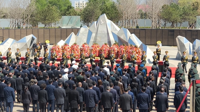 新黄河客户端沈阳4月23日电(记者李庆斌 张焱辉) 4月23日上午,第十三批在韩中国人民志愿军烈士遗骸安葬仪式在沈阳抗美援朝烈士陵园举行。跨越七十余载岁月,12位英烈终魂归故土。
