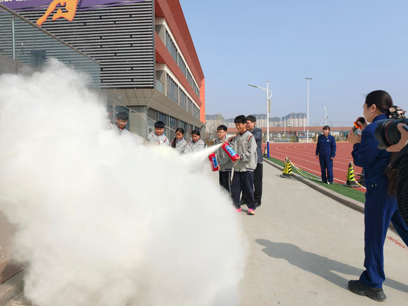 Firefighters from the Dezhou fire rescue division instruct students on the use of fire extinguishing equipment on March 27. [Photo by Lin Anqi/For chinadaily.com.cn]