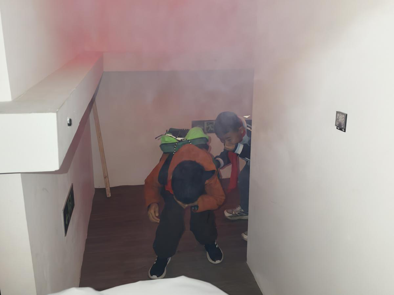 Students practice evacuating through a simulated smoke-filled passage under the guidance of firefighters on March 21. [Photo by Lin Anqi/For chinadaily.com.cn]
