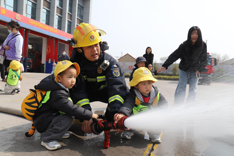 Firefighters from the Rizhao High-tech Industrial Development Zone fire rescue brigade in Shandong province show students how to use a fire hose on March 27. [Photo by Jian Jing/For chinadaily.com.cn]