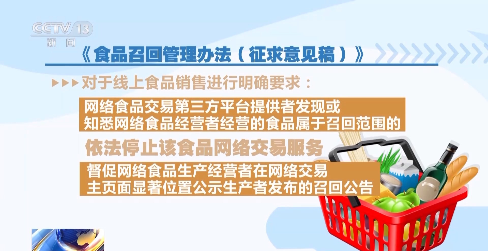 记者从市场监管总局了解到,新版《食品召回管理办法(征求意见稿)》明确了召回形式,召回的等级,以及召回启动时限。保障食品召回工作精准、高效落实。