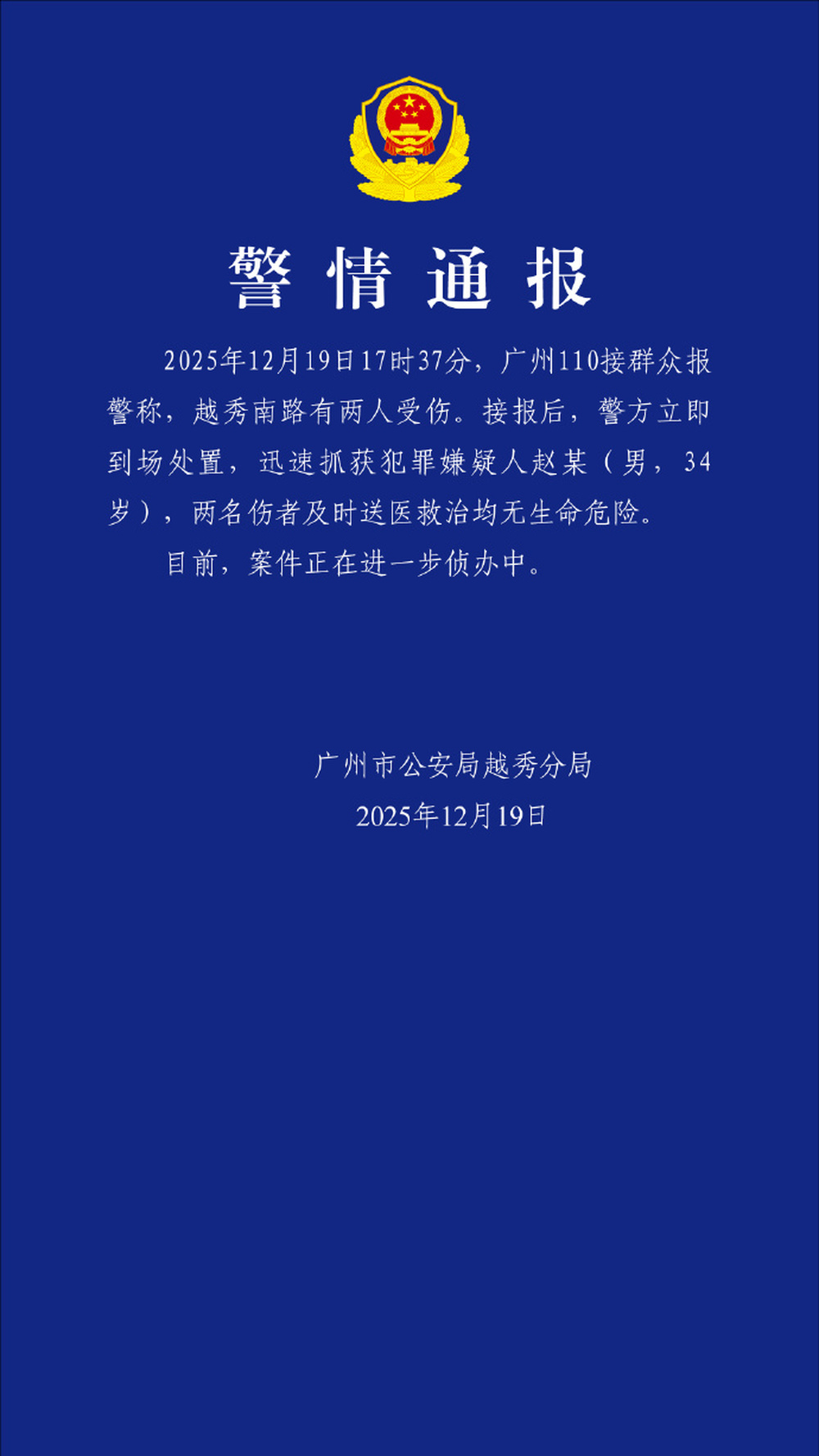 12月19日晚,广州市公安局越秀区分局官方微博发布警情通报: