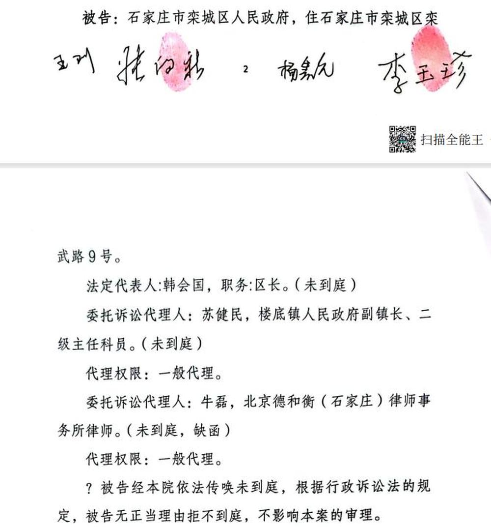 庭审笔录显示,栾城区政府经法院传唤未到庭,无正当理由拒不到庭,被判定缺席审判。
