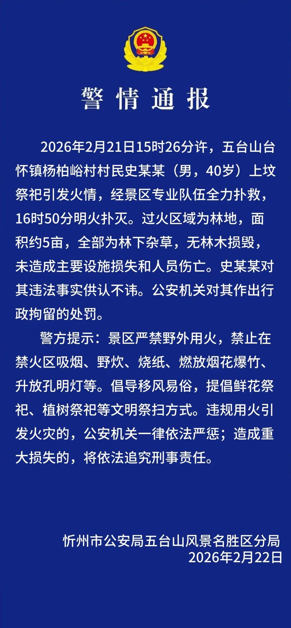 2026年2月21日15时26分许,五台山台怀镇杨柏峪村村民史某某(男,40岁)上坟祭祀引发火情,经景区专业队伍全力扑救,16时50分明火扑灭。过火区域为林地,面积约5亩,全部为林下杂草,无林木损毁,未造成主要设施损失和人员伤亡。史某某对其违法事实供认不讳。公安机关对其作出行政拘留的处罚。