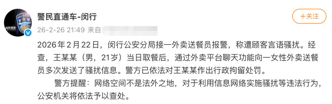 2月26日,@警民直通车-闵行 发布警情通报:2026年2月22日,闵行公安分局接一外卖送餐员报警,称遭顾客言语骚扰。经查,王某某(男,21岁)当日取餐后,通过外卖平台聊天功能向一女性外卖送餐员多次发送了骚扰信息。警方已依法对王某某作出行政拘留处罚。