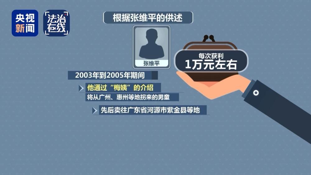 根据张维平的供述:2003年到2005年期间,他通过“梅姨”的介绍,将从广州、惠州等地拐来的男童,先后卖往广东省河源市紫金县等地,每次获利1万元左右。2018年12月,广州市中级人民法院一审宣判,以拐卖儿童罪判处张维平死刑、周容平死刑、判处杨朝平、刘正洪无期徒刑、陈寿碧有期徒刑十年。2023年4月,张维平、周容平被执行死刑。