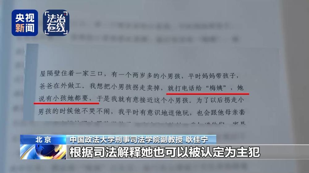 耿佳宁:“梅姨”的行为符合中转、贩卖这两个环节,所以她跟实施了拐孩子,拐骗行为、绑架行为的犯罪嫌疑人,其实是同罪的。“梅姨”寻找、确定买家,商定买卖价格,对拐卖的系列犯罪能够持续进行,起到了非常大的推动作用。可以理解她起的是主要作用,而且她不是被动参加的,她是积极参加的。根据司法解释,她也可以被认定为主犯。