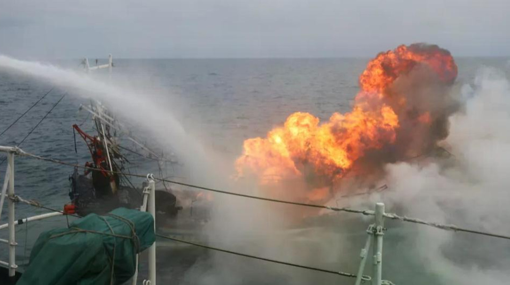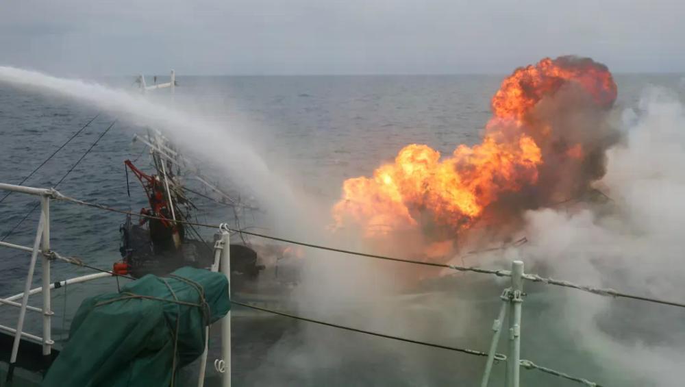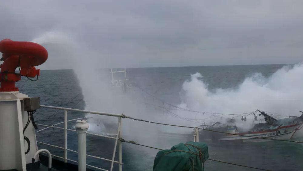 △海警舰艇对失火渔船进行灭火
