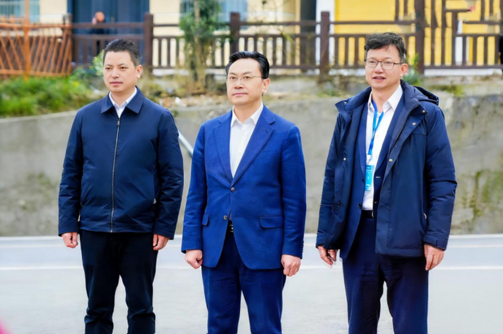 中国工程院院士刘仲华(左二)、中国国际茶文化研究会副会长王岳飞(右一)、古丈县委书记滕朝辉(左一)考察正山堂·古丈红数字化工厂