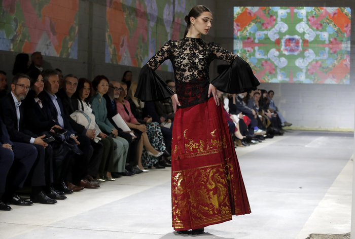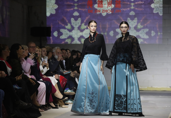活动现场,山东省服装设计协会会长、济南国际传播中心特约专家顾问周锦女士特邀湖北美术学院时尚艺术学院表演与传播系主任姜晓曦共同参与本次国际展演,强强联手为现场观众献上极具东方韵味的时尚大秀。本次大秀精心呈现三大系列作品:蕴含六十甲子文化的鲁绣马面裙、诠释二十四节气内涵的鲁锦马面裙,以及彰显十二花神雅致意境的马面裙系列。周锦女士深耕中华传统文化,将鲁锦、鲁绣非遗技艺与传统服饰形制精妙融合,凭借对传统文化的深刻解读赢得全场高度赞誉。
