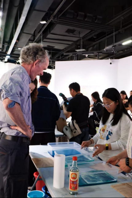 参与者首先从艺术家准备的底片中挑选心仪的图案。随后取用提前涂好感光药剂的相纸,将图案小心放置在纸上,盖上玻璃板并用夹子固定。在专业晒版机内置紫外线灯下曝光约3分钟后,艺术家带领大家拆开作品,依次放入两盆清水中漂洗。原本泛着淡黄绿色的相纸,在清水冲洗下渐渐显现出标志性的普鲁士蓝色,现场不断响起惊叹声。