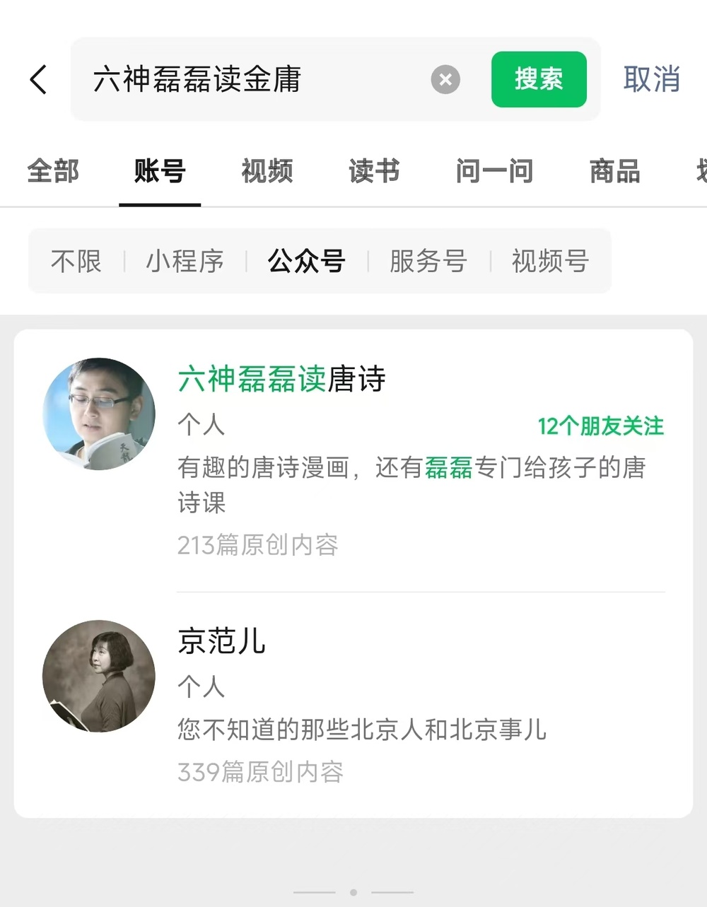 14日下午,新黄河注意到,未关注该账号者已无法通过搜索功能找到“六神磊磊读金庸”的微信公号。