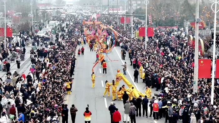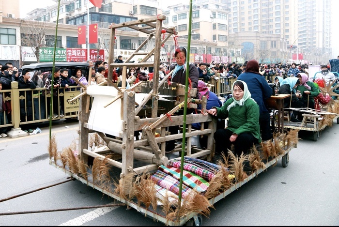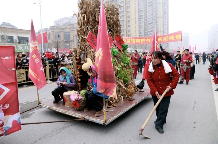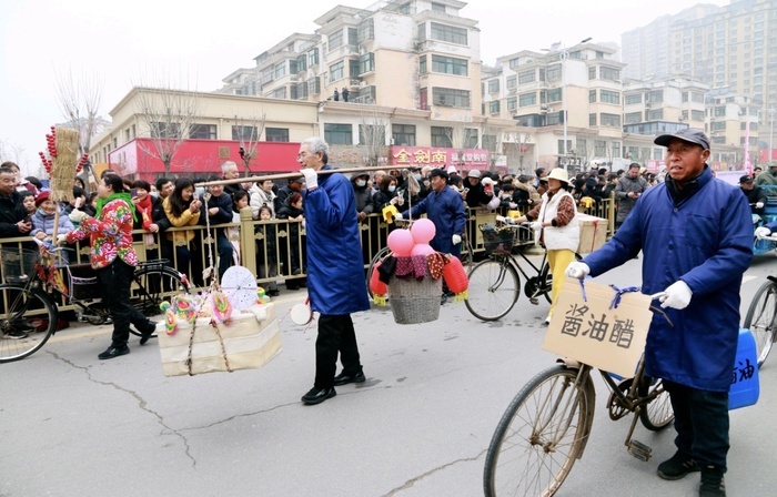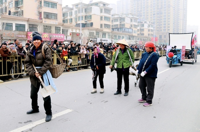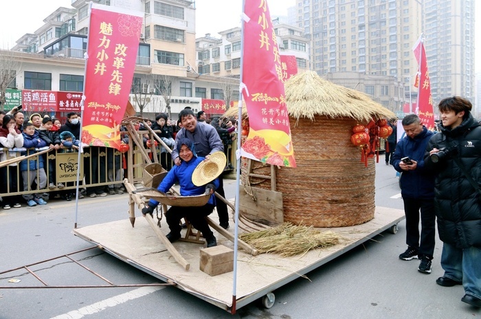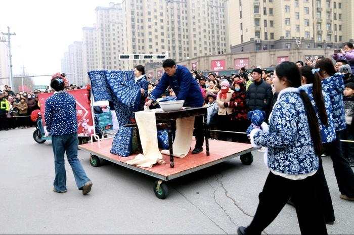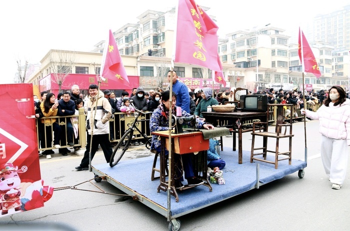 上午9时,伴随着欢快的锣鼓声,巡演正式拉开帷幕。秧歌队、舞龙队、旱船队依次登场,演员们身着鲜艳的服装,用质朴的表演点燃了节日氛围。而在队伍中段,一个特殊的方阵吸引了众多目光:老式纺织机“吱呀”作响,仿佛在吟唱岁月的歌谣;犁、耙、石碾等传统农耕用具整齐排列,无声诉说着黄河滩区曾经的耕作故事;几位演员扮作走街串巷的货郎,用地道的“东明吆喝”叫卖着记忆中的零食与杂货……一幕幕上世纪80年代的生活场景被原汁原味地再现。