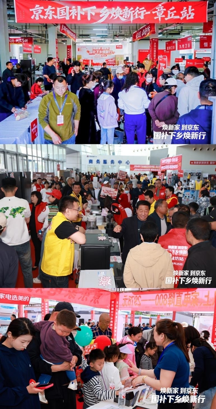 4月25日,在山东省商务厅指导下,京东“国补下乡焕新行”活动同步落地山东菏泽、章丘、潍坊三地,活动联合当地京东家电专卖店及京东3C数码门店,将冰箱、电视、洗衣机、手机、电脑等上千款家电和3C产品带到现场,让周边乡村用户在家门口就能体验和选购,点燃乡村消费烟火气。现场人气火爆,周边居民络绎不绝,展区内围满了前来咨询和选购的消费者,氛围热烈。