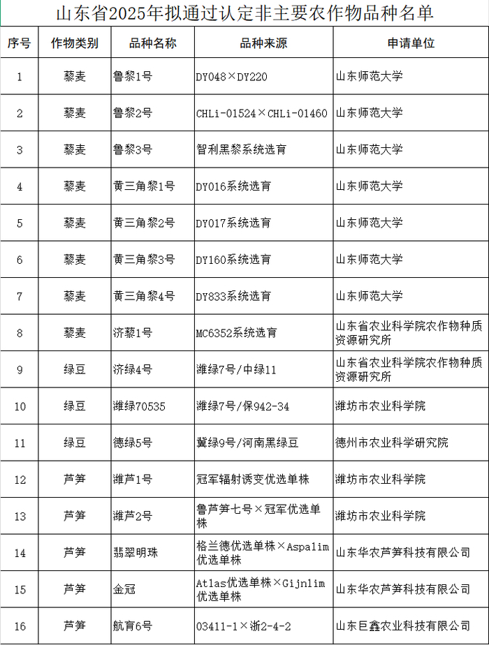 12月10日,新黄河记者从山东省农业农村厅了解到,省农业农村厅发布关于山东省2025年拟通过认定非主要农作物品种的公示。根据《山东省种子条例》《关于开展非主要农作物品种认定工作的通知》(鲁农种字〔2025〕10号)有关规定,经育种者申报、市级推荐、省级专家评审,拟认定藜麦、绿豆、芦笋等三种作物16个品种,现向社会公示,公示期为5个工作日(2025年12月10日至2025年12月16日)。公示期内如有异议,可向省农业农村厅实名反映。