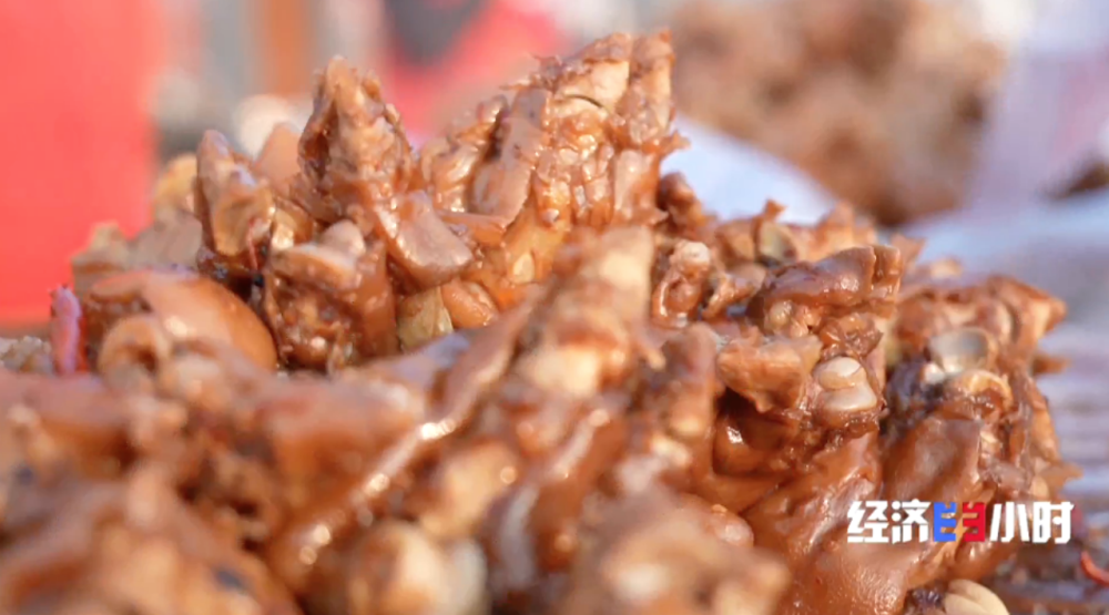 美食摊位区,一个猪蹄摊位前格外热闹。鲜红油亮的猪蹄香气四溢,吸引了不少游客购买。