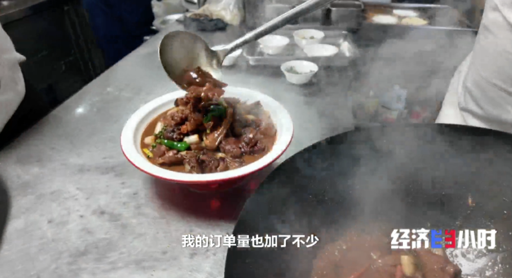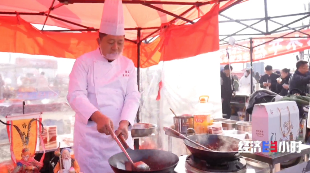韩成说,曹洼大集爆火后,他们摊位的生意越来越好。一次大集韩成能收入2-3万块钱,比之前翻了好几倍。如今,不仅食材原料越备越多,伙计也从以前四五个人,增加到17个人。摊位更是从之前的露天棚变成了现在的钢管棚。