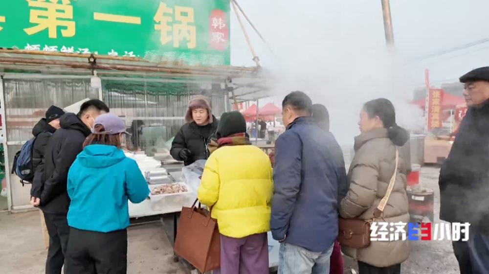 早上7点多,韩成的摊位迎来了第一拨赶集的游客。一碗羊汤热气腾腾,驱走冬日的严寒。“10元吃饱,20元吃好”是他摊位的宗旨。摊位前,顾客排起了长队,很多人都是远道而来赶曹洼大集。