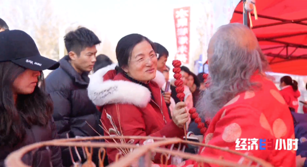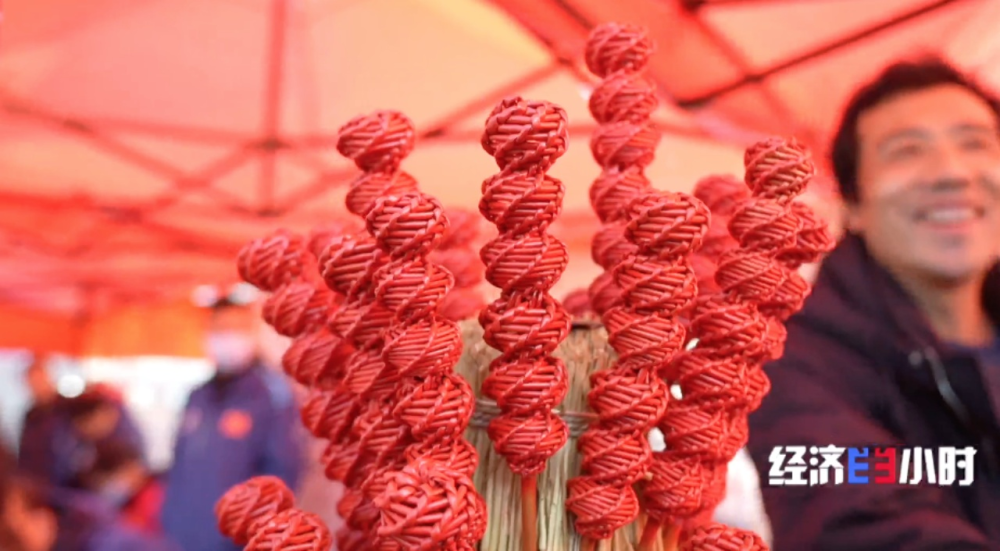 非遗摊位前,穿着红色唐装的摊主格外引人注目,走近发现他手里拿的红彤彤的“糖葫芦”竟是用柳条编成的。