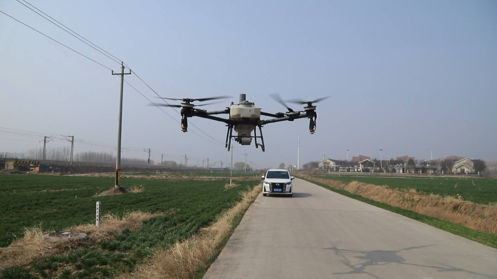 在现场,无人机装满农药和植物调节剂,随着机手的操纵,它腾空而起,沿着预设航线匀速飞行,将调配好的药剂均匀雾化喷洒在麦苗上,展现出一幅美丽的画面。