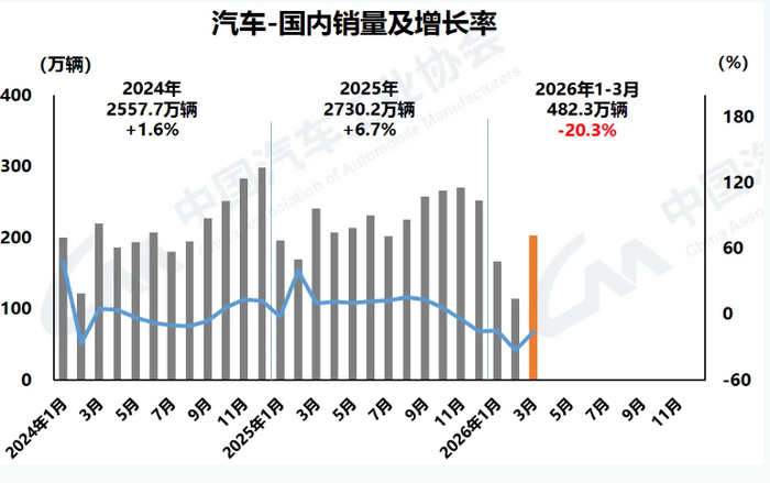 2026年开年,国内汽车市场遭遇阶段性“倒春寒”。4月10日,中国汽车工业协会发布的最新一期汽车工业产销情况显示,今年一季度,汽车产销分别完成703.9万辆和704.8万辆,同比分别下降6.9%和5.6%。其中,汽车国内销量482.3万辆,同比下降20.3%。同期,乘用车国内销量401.3万辆,同比下降23.4%。