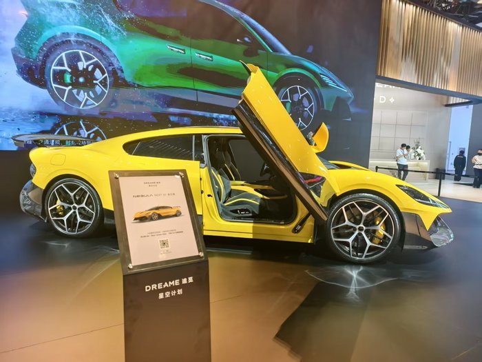 其中黄色的Nebula NEXT 01打开了车门,可以看到内饰部分;红色的Nebula NEXT 01X可以透过车窗模糊看到内部座椅,而另外两台展车完全看不到内部。现场工作人员介绍,看不到内部是早期的工程样车。